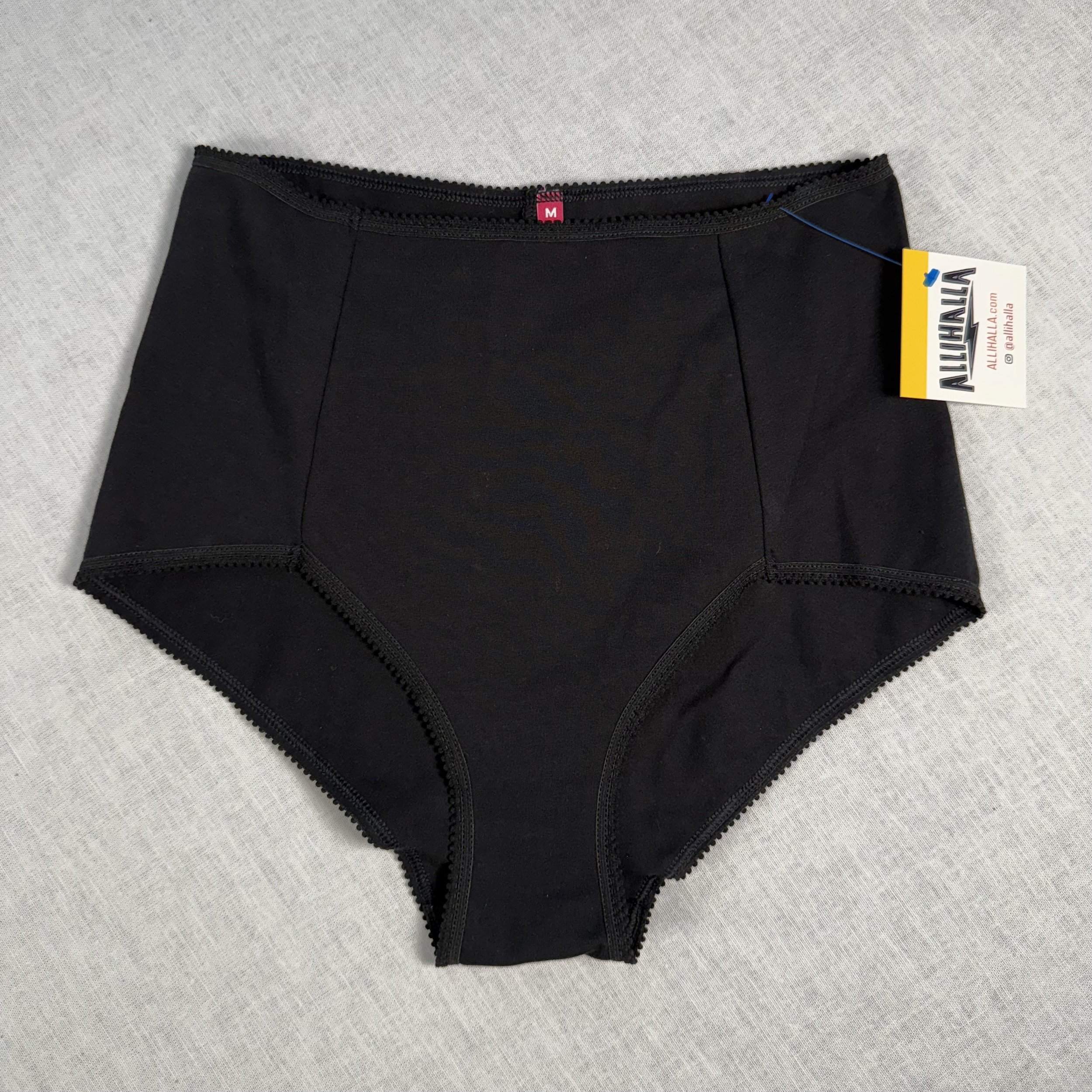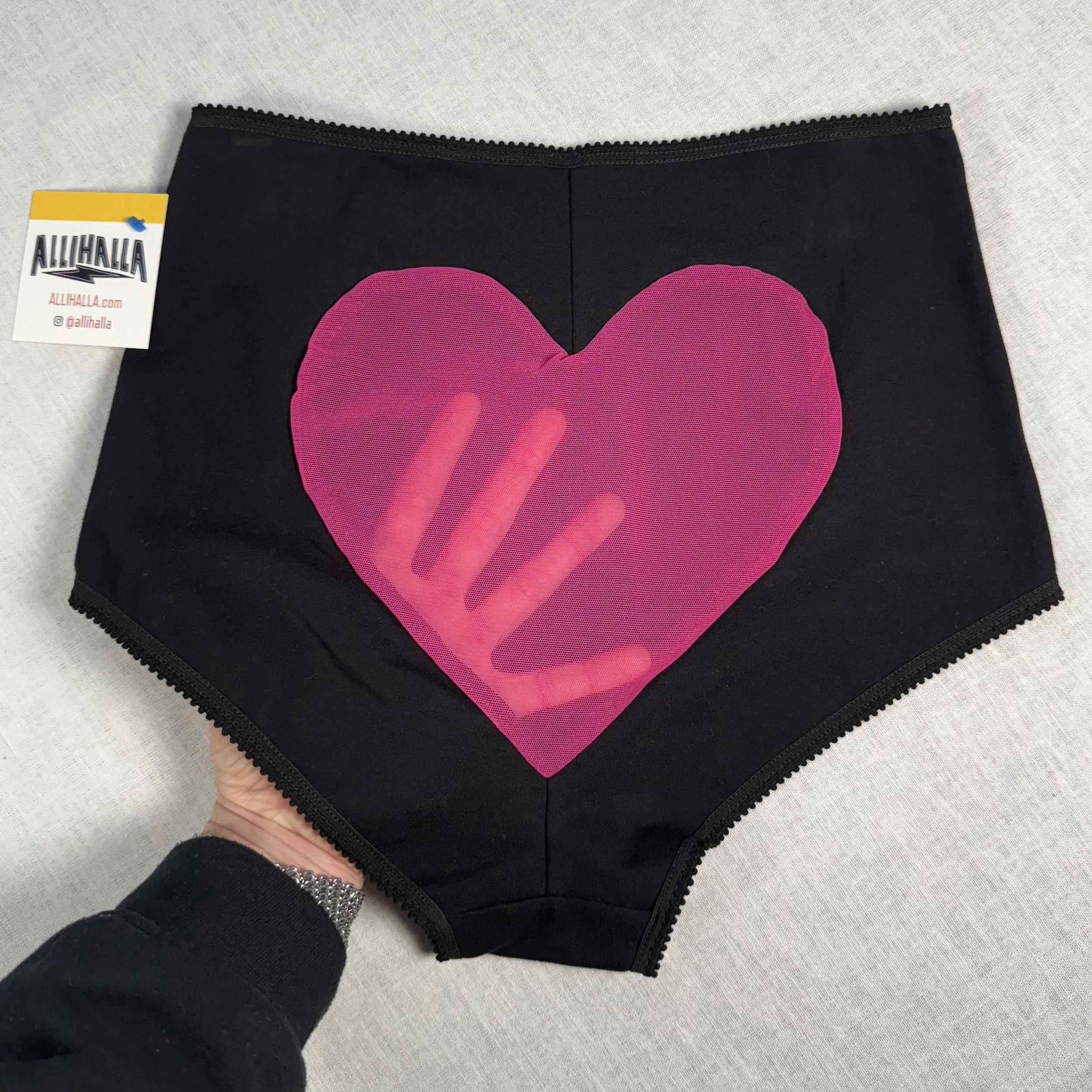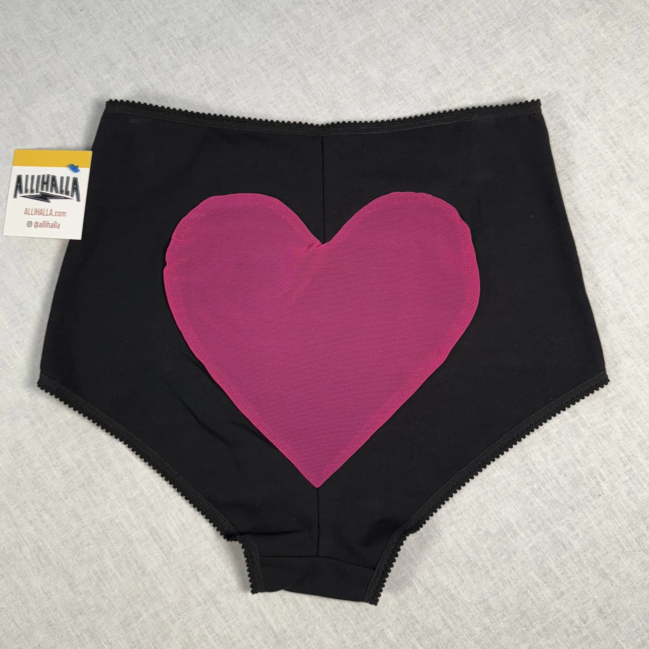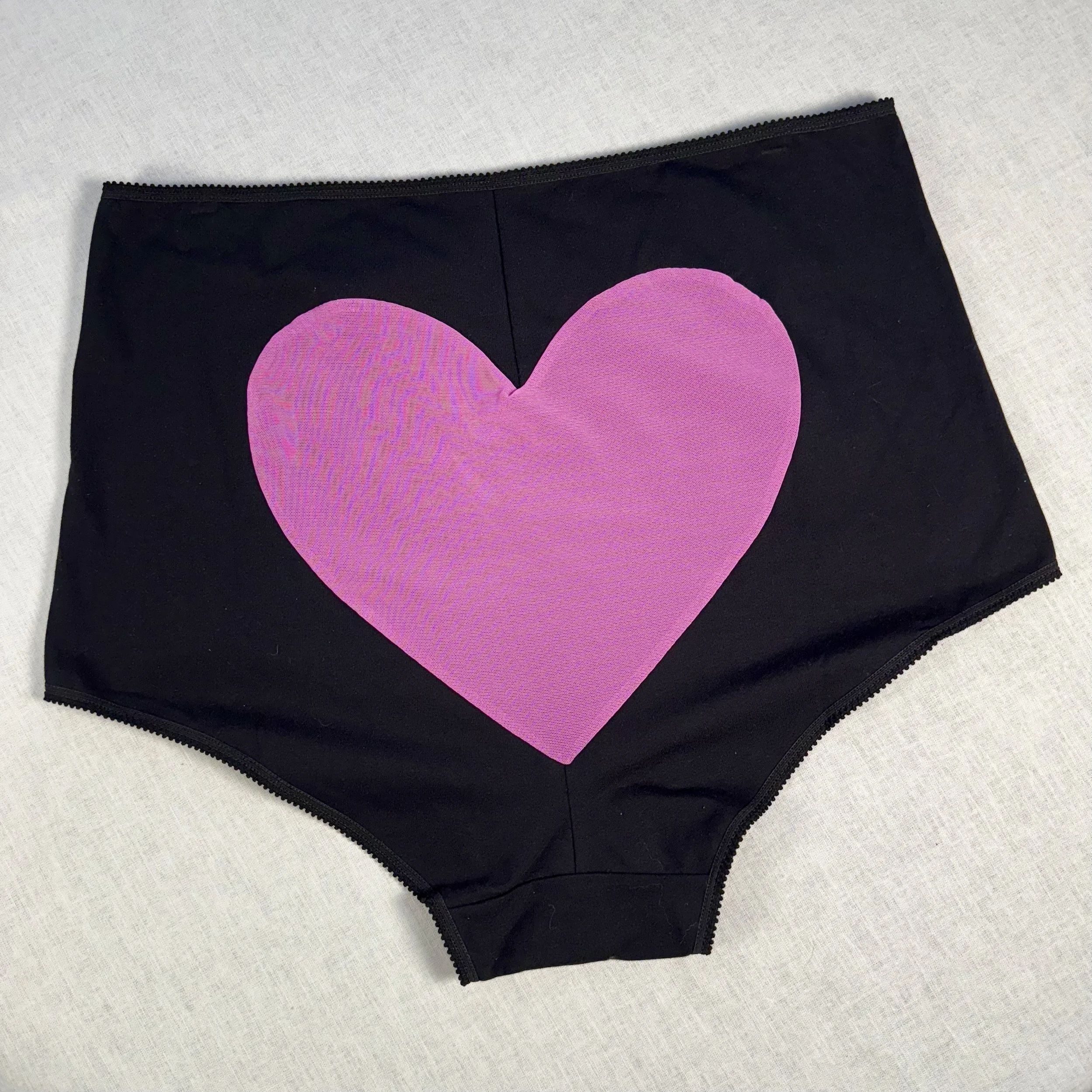 High in the waist, low in the leg, a little cheeky in the bum. These are a variation from my classic underwear cut. Comfy black cotton trimmed with thin black dot elastic throughout, and a perfect mesh (see through!) heart on the butt to show your perfect butt some love.